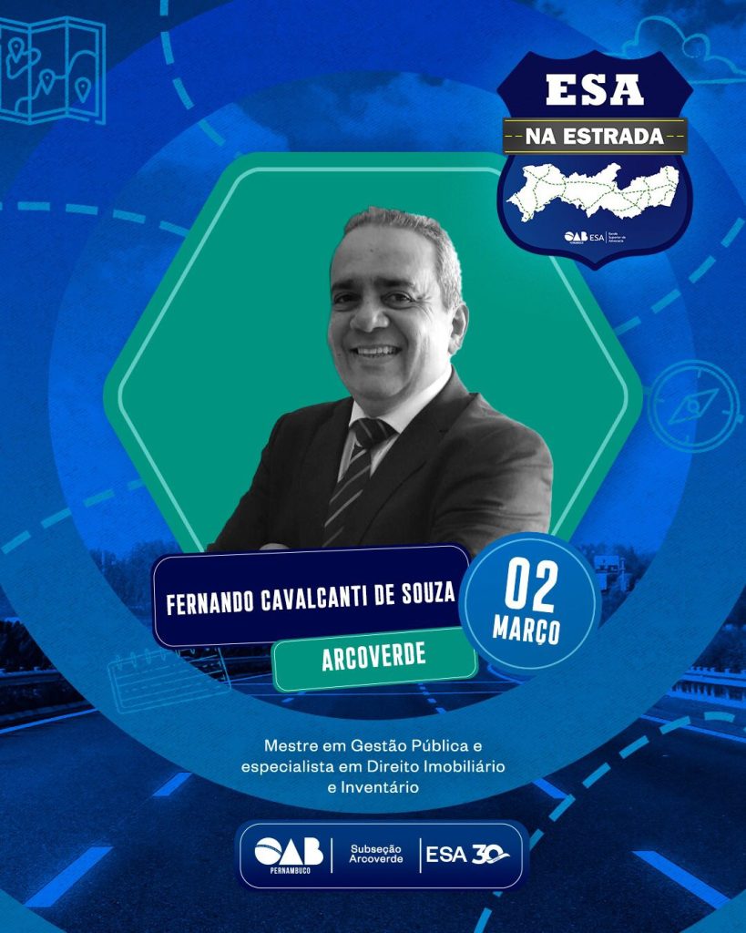 No dia 02 de março a Faccon, em parceria com a OAB Arcoverde, estará recebendo o “ESA na Estrada”, com Fernando Cavalcanti de Souza, mestre em gestão pública e especialista em Direito Imobiliário e Inventário. Na ocasião, serão abordados temas como inventário, testamento, divórcios e procedimentos no extrajudicial. Te esperamos lá!