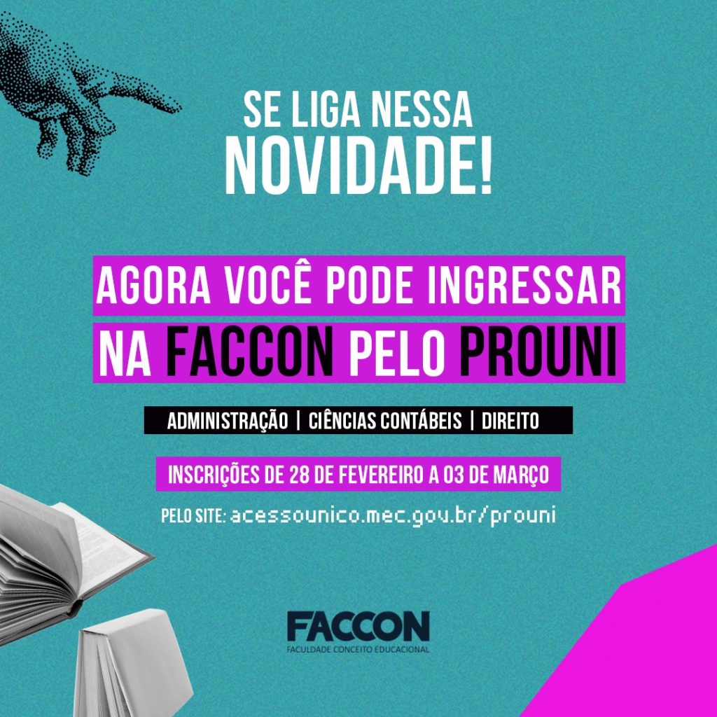 Faccon oferece bolsas por meio do Prouni A Faccon está com uma grande novidade para encerrar fevereiro. A partir de agora, vamos oferecer bolsas por meio do Prouni. É mais uma oportunidade para você estudar com a gente. As inscrições começam hoje e vão até o dia 03 de março no site https://acessounico.mec.gov.br/prouni.